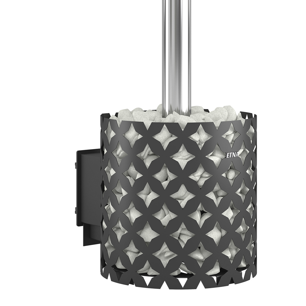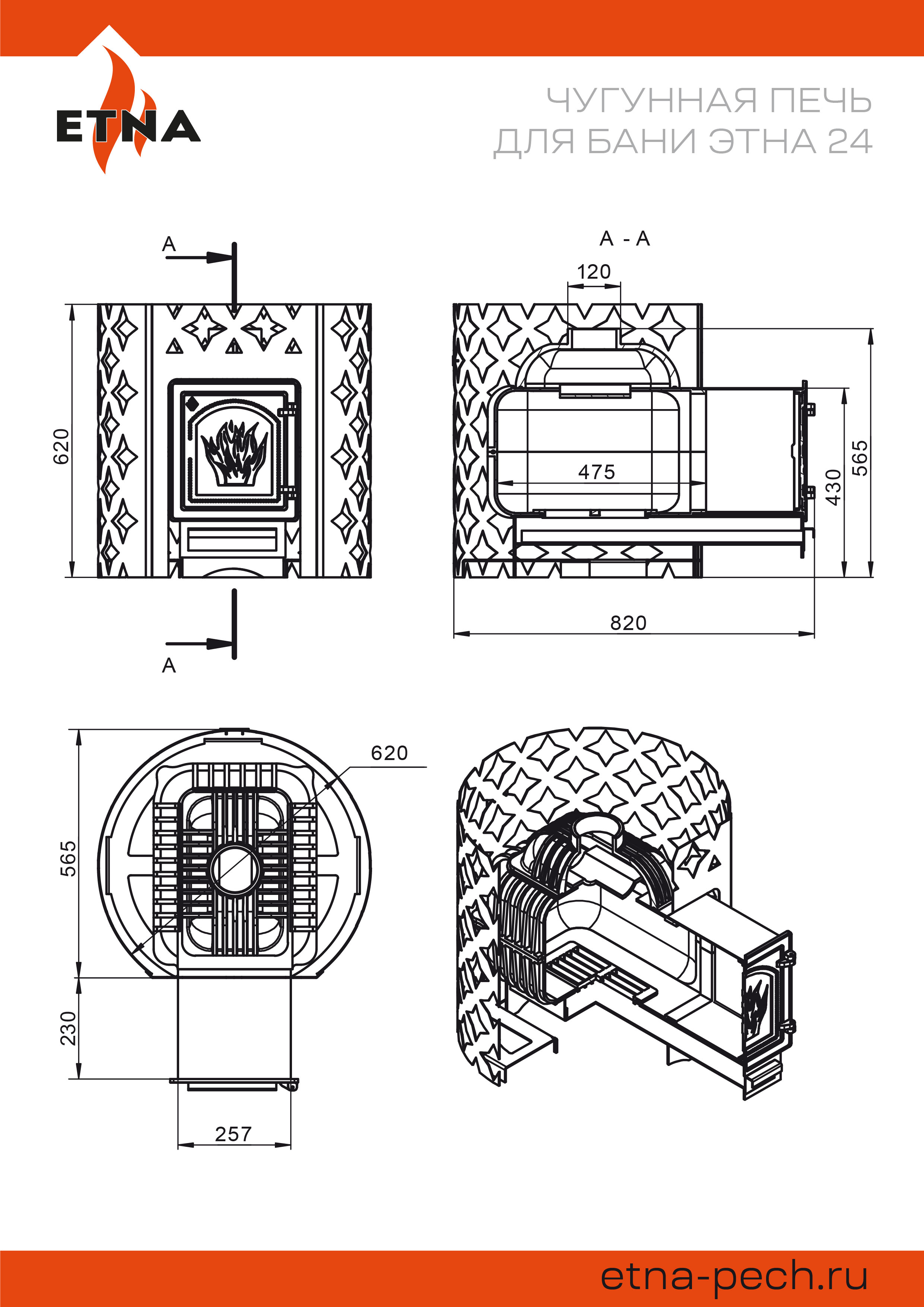 Чугунная банная печь ЭТНА 24 (ДТ-4) рассчитана на работу в парной объёмом до 24 м3. Цельно литая чугунная дверца сохраняет свою форму при нагревании. Крепление дверок к топочному тоннелю – болтовое, позволяет снимать и заменять дверку. Для устройства наружной открытой каменки печь ЭТНА 24 оснащается металлическим кожухом с прорезным рисунком оригинального дизайна. Пространство между печью и кожухом из двухмиллиметровой стали заполняется камнями для бани, которые выполняют роль теплонакопителя и защищают парящихся от жёсткого инфракрасного излучения. Кожух диаметром 620 миллиметров вмещает в себя до 150 килограммов камней крупной и средней фракции.