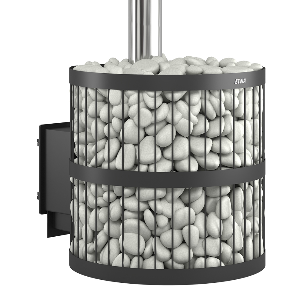 Чугунная банная печь ЭТНА 24 (ДТ-4С) рассчитана на работу в парной объёмом до 24 м3. Цельно литая чугунная дверца сохраняет свою форму при нагревании. Крепление дверок к топочному тоннелю – болтовое, позволяет снимать и заменять дверку. Сетка для камней сделана в виде корзины из стального прутка диаметром 6 миллиметров. Три кольца из стальной полосы толщиной 2 миллиметра придают сетке дополнительную прочность и улучшают внешний вид. Сетка изготовлена из конструкционной стали. По всей высоте в сетку укладываются камни для бани. Заклад обеспечивает работу открытой каменки, а также равномерно распределяет тепло в пространстве парной, а так же защищают парящихся от жёсткого инфракрасного излучения. Кожух диаметром 560 миллиметров вмещает в себя до 120 килограммов камней крупной и средней фракции.