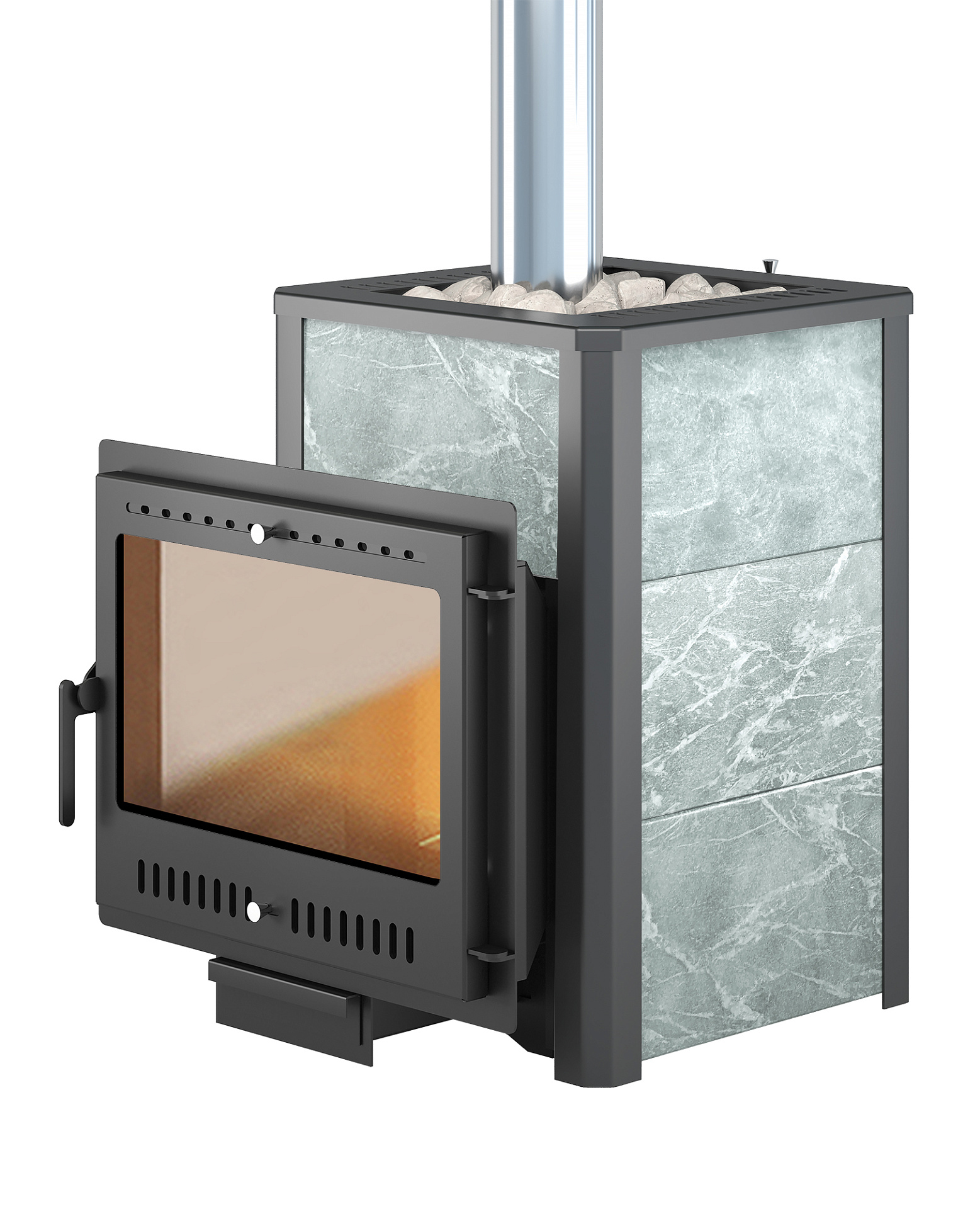 Конвекционно–вентилируемая облицовка, изготовленная из экологически чистой горной породы , который обладает большой теплоёмкостью, что позволяет камню в короткие сроки нагреваться и максимально долго удерживать стабильную температуру в парильном помещении, а также гасить жёсткое инфракрасное излучение Камень обладает исключительными лечебными свойствами: помогает при головных болях, при нестабильном артериальном давлении, при простудных заболеваниях, воспалительных процессах в почках и пищеварительной системе, снимает повышенную возбудимость и нервозность, сглаживает эмоциональные всплески. Облицовка из натурального камня при нагреве способна аккумулировать тепло, что гарантирует максимально равномерный прогрев и сохранение тепла Банная печь Легенда 22 Панорама "М" талькохлорит укомплектован чугунной каминной, самоохлаждаемой дверцей Везувий 505 с большим жаропрочным стеклом «SCHOTT ROBAX», с оборудованной системой самоочистки, что позволяет визуально контролировать горение и любоваться видом живого огня. Данная печь рассчитана на объем парильного помещения 12-24 м3.Дымоход и комплектующие