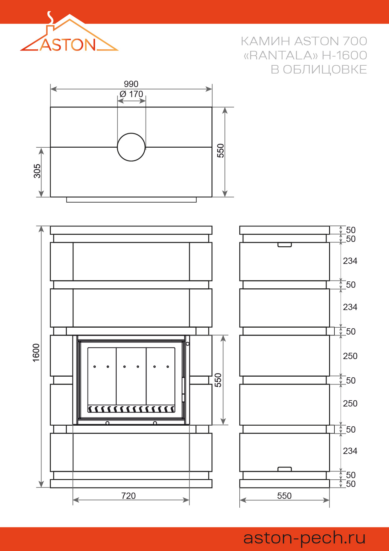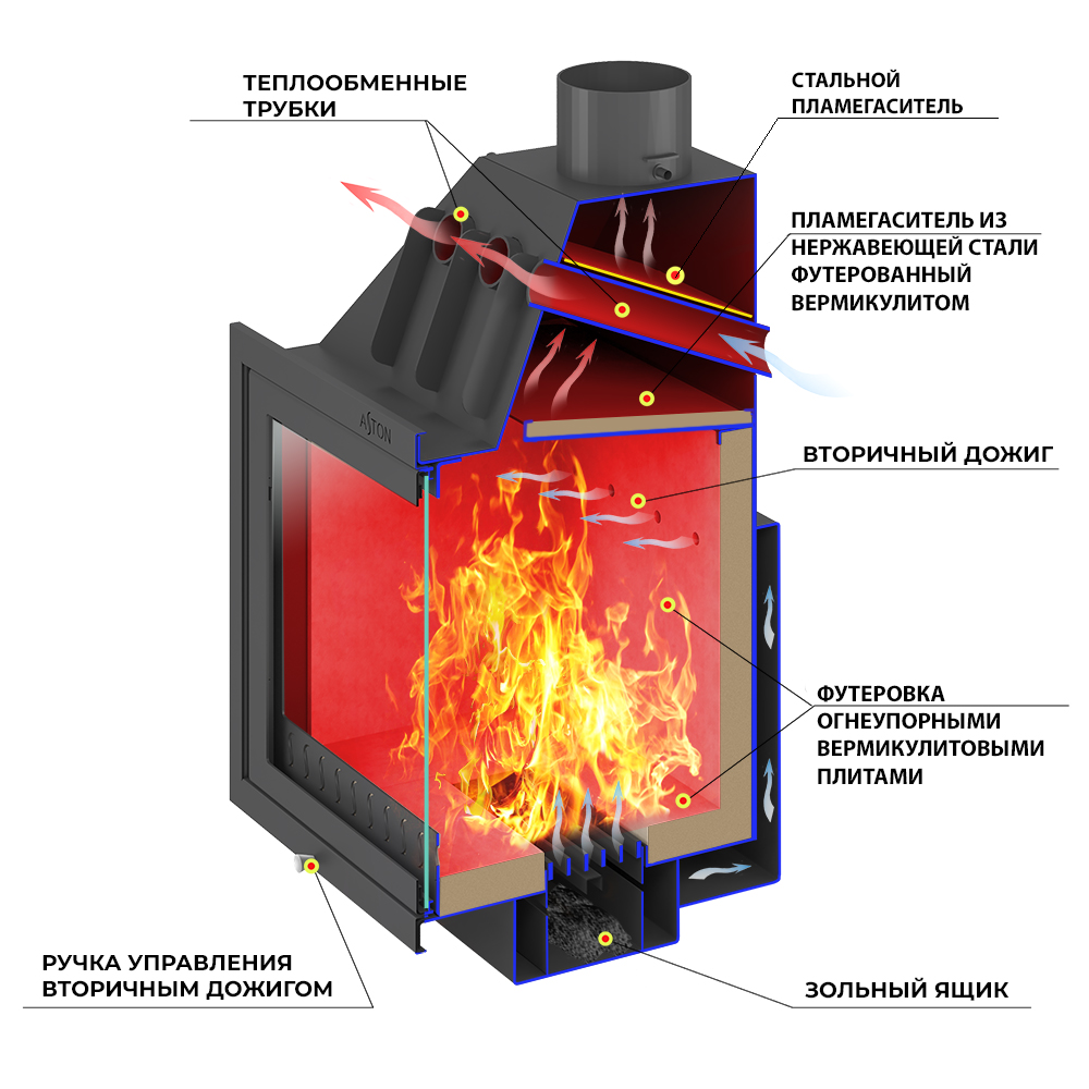 Топка АСТОН (ASTON) 700 внутри облицовки размещается на подставке. Топка, подставка и облицовка отлично походят друг к другу и не требуют дополнительной подгонки. Свободное пространство между топкой и облицовкой предназначено для движения нагретого воздуха. Именно за счёт конвекции быстро нагревается пространство, что уже в первые минуты работы топки обеспечивает тепло в помещении.