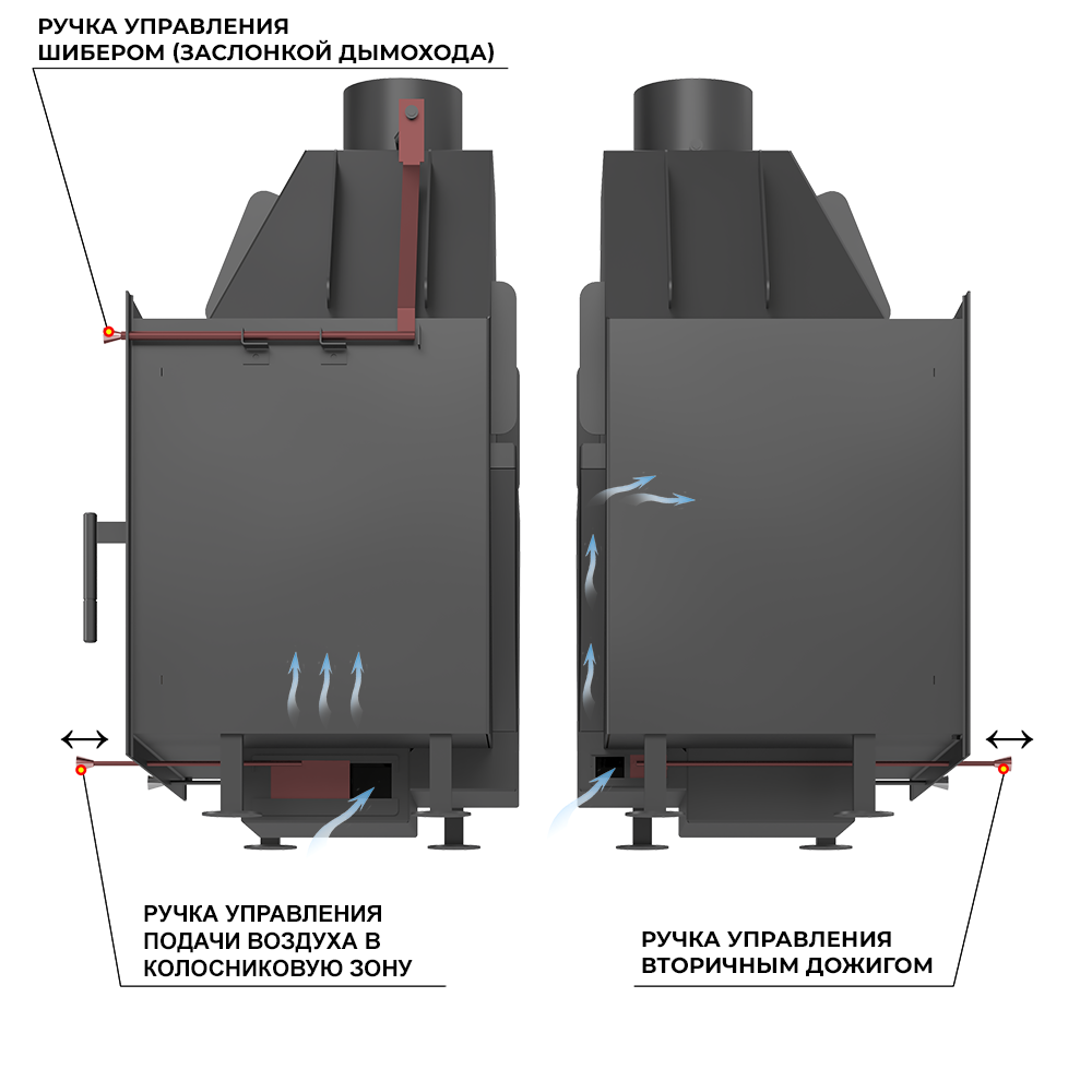 Все элементы управления выведены на переднюю поверхность самой каминной топки, и наличие облицовки никак не сказывается на удобстве обслуживания топочной камеры.