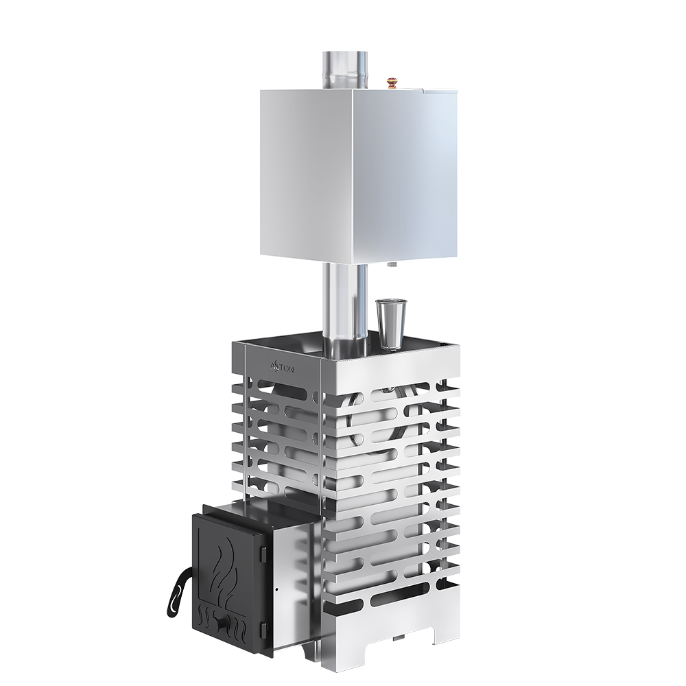 Стальной кожух открытой каменки вмещает в себя до 160 килограммов банного камня.